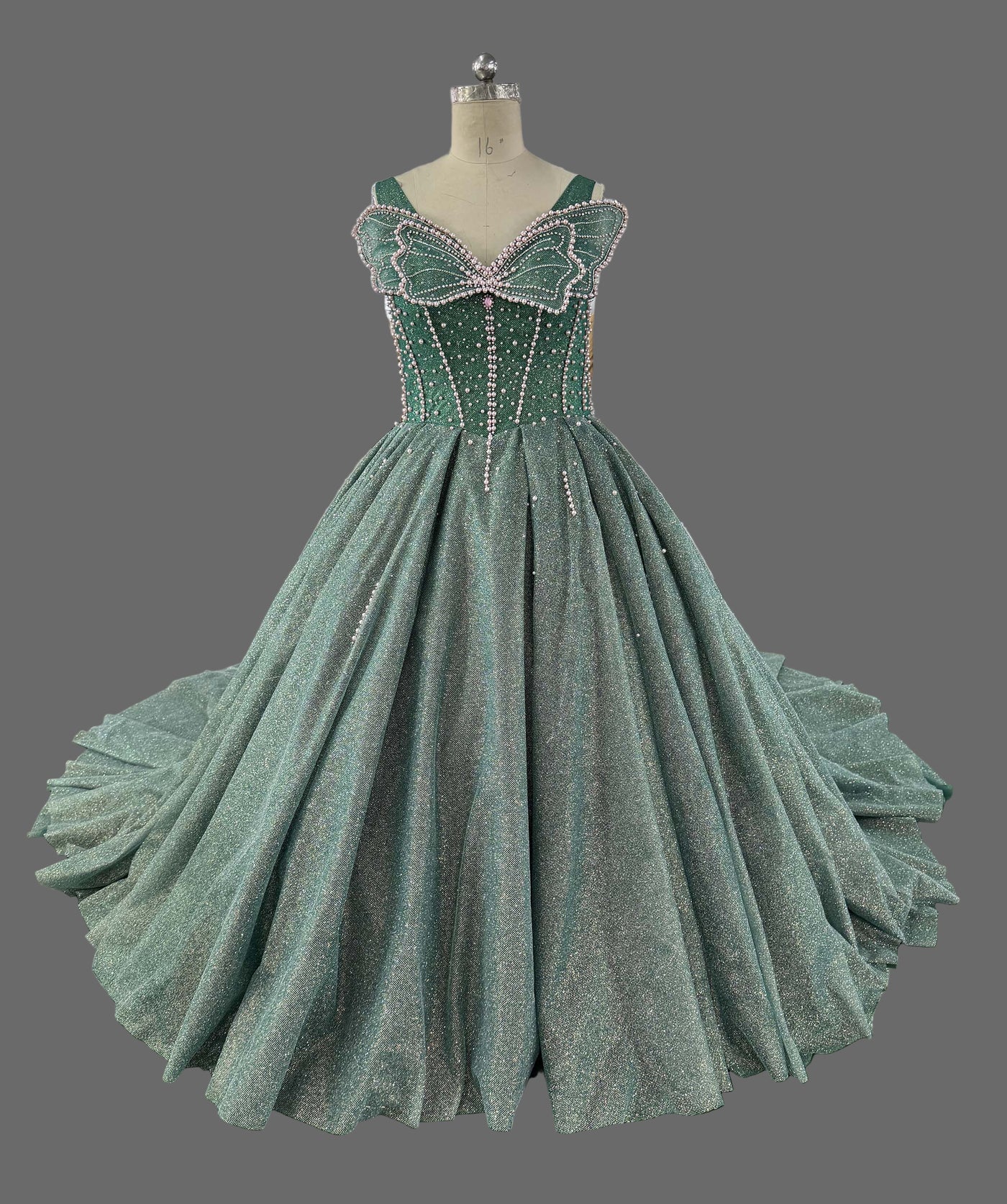 Embellishments: Hand-beaded sweetheart bodice with crystal