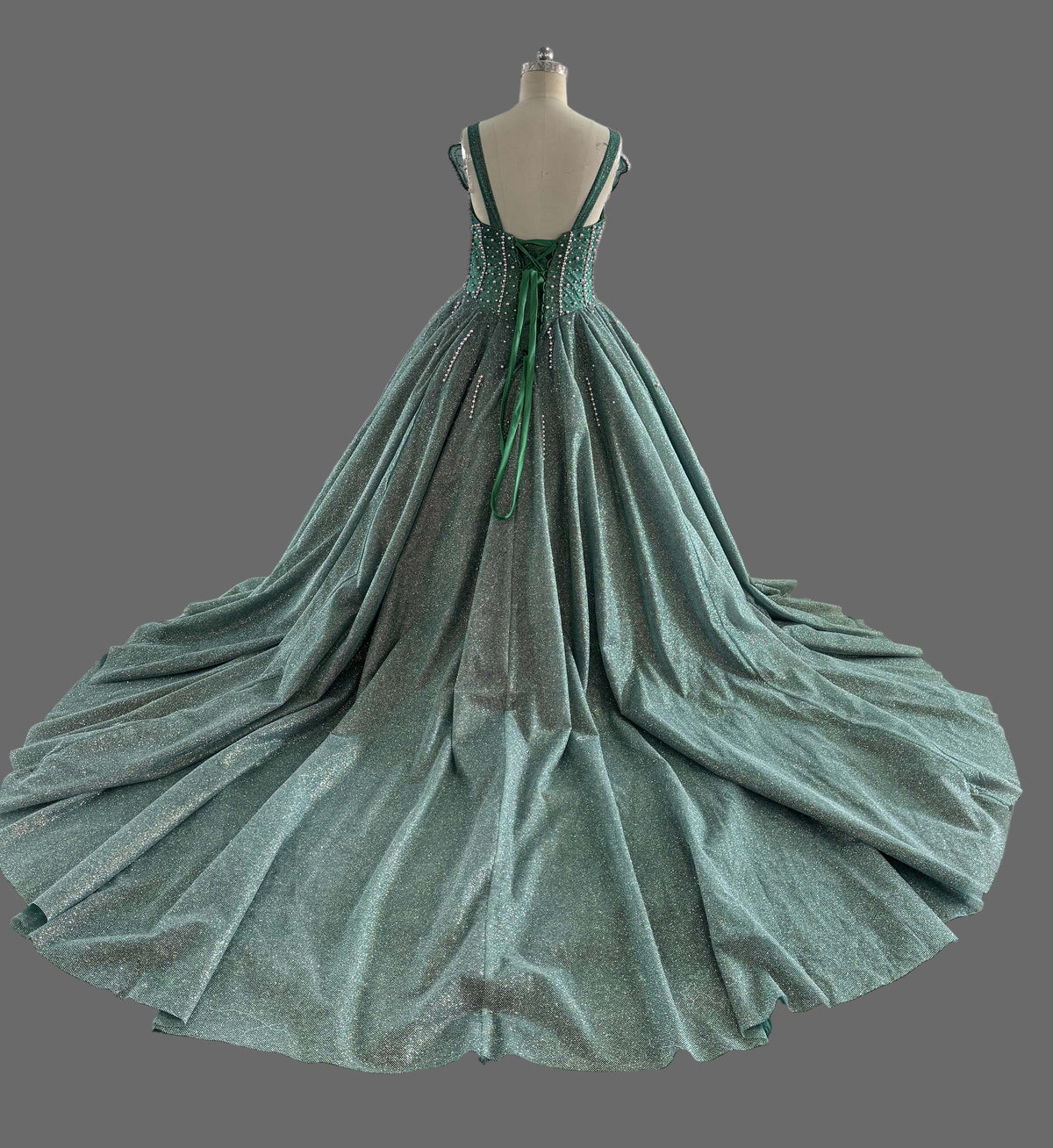 Make an unforgettable entrance in this stunning emerald green ball gown that combines luxury and elegance. This breathtaking dress features an intricately beaded sweetheart neckline adorned with sparkling crystals and rhinestones in an exquisite geometric pattern.
