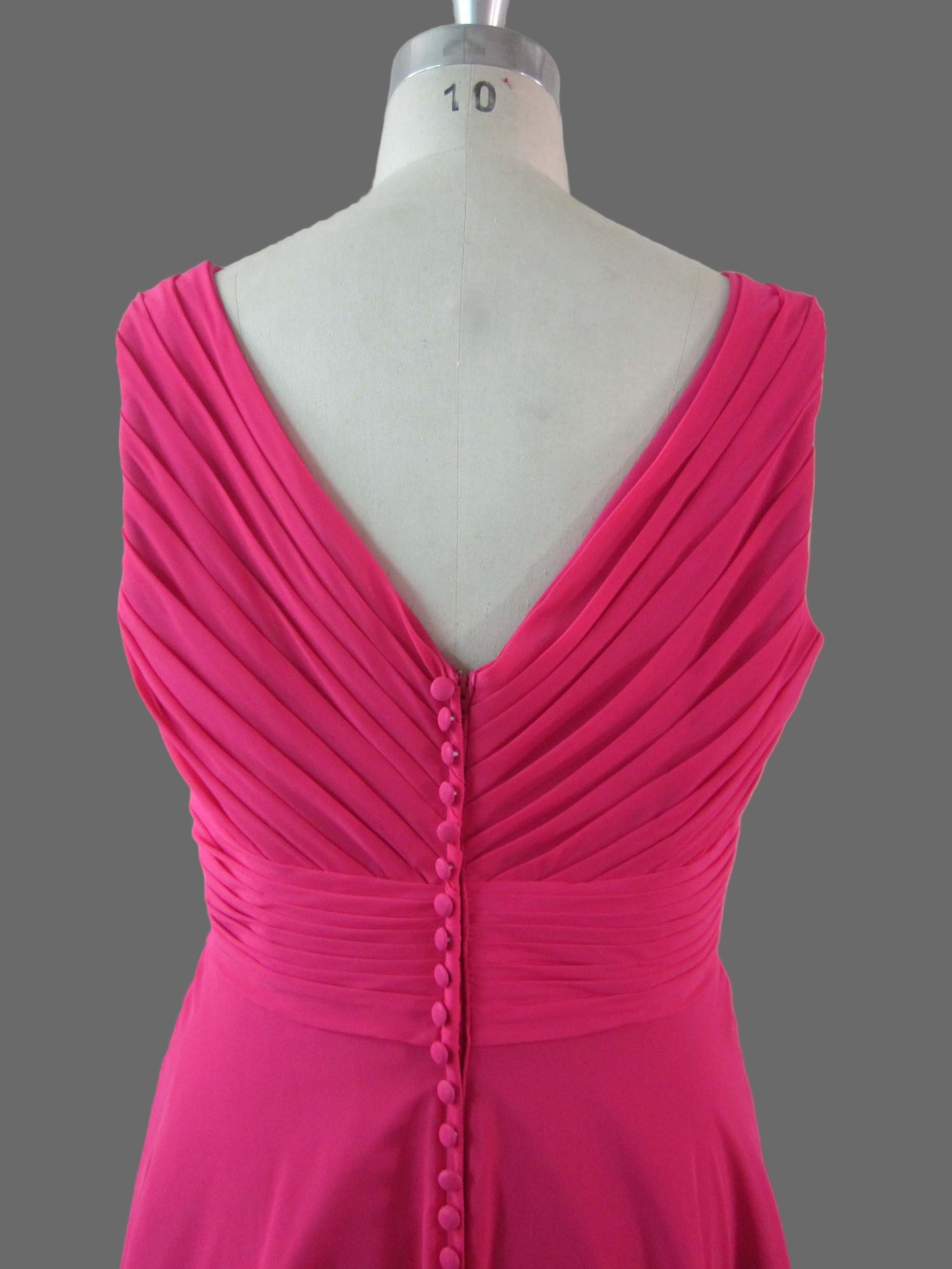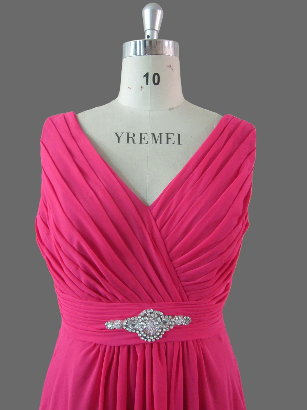 Stunning hot pink bridesmaid dress featuring a flattering V-neckline and beautifully ruched bodice. This elegant A-line gown is crafted from flowing chiffon with a sparkling crystal belt accent at the waist. Perfect for weddings, formal events, and special occasions. The sleeveless design and floor-length silhouette create a timeless, sophisticated look. Available in custom sizes with full lining and back corset closure for the perfect fit.
