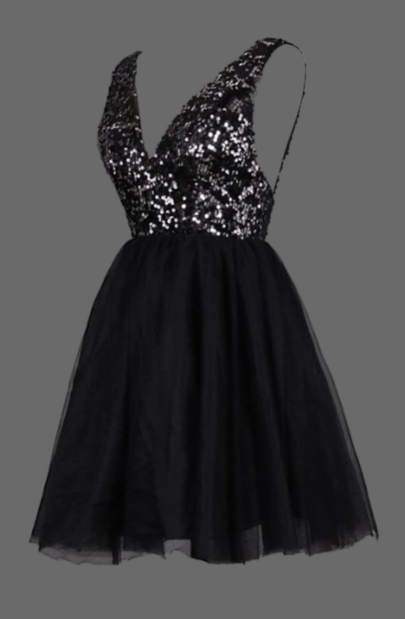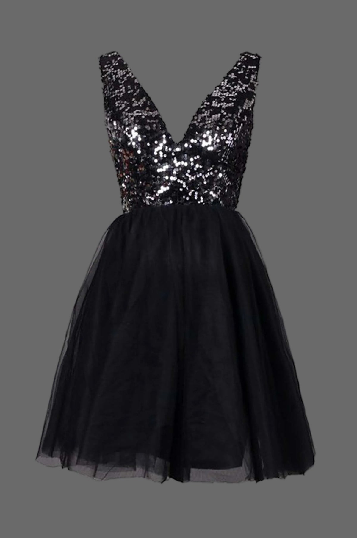 Stunning black cocktail dress featuring a dazzling sequined bodice and romantic tulle skirt. This eye-catching party dress combines glamour and elegance for your special occasions.