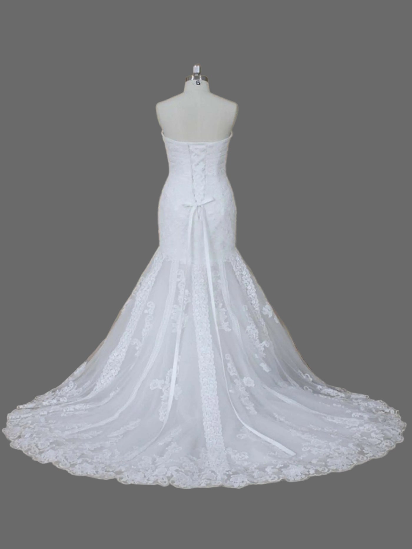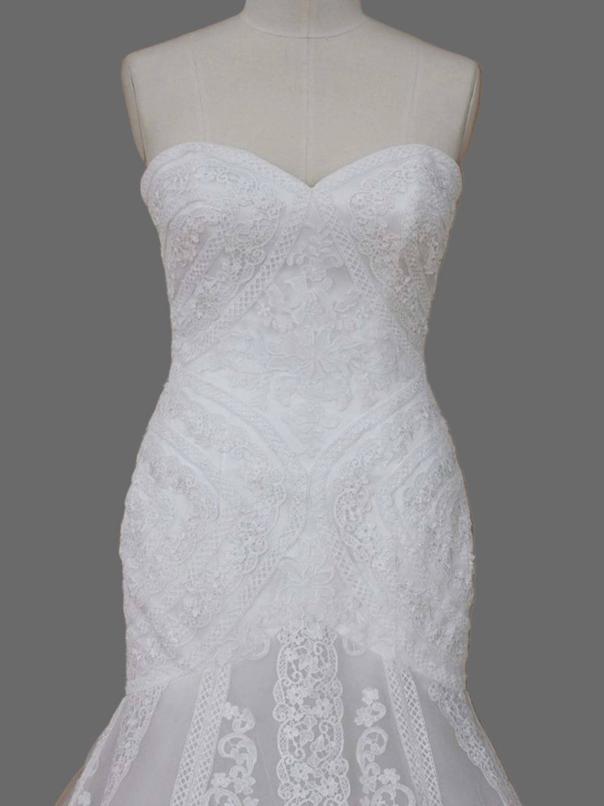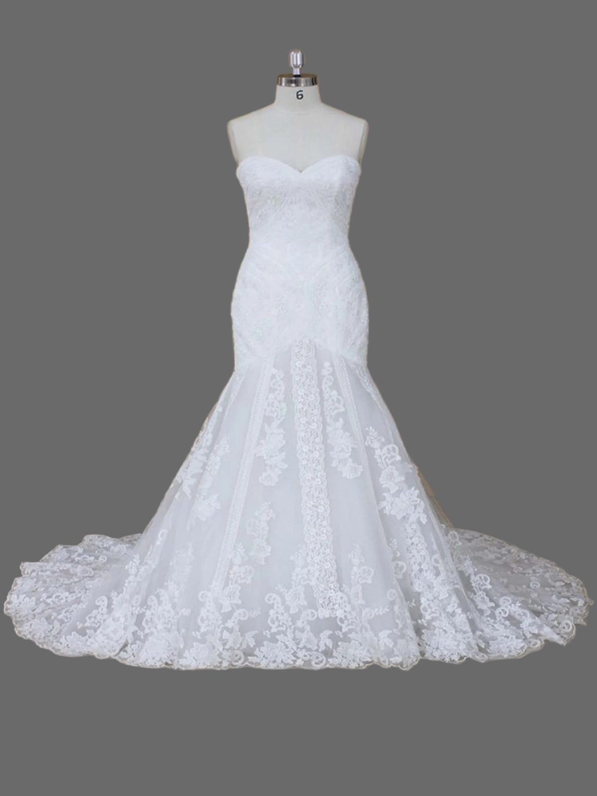 Make a breathtaking entrance in this exquisite strapless mermaid wedding dress adorned with dimensional floral lace appliqués. This romantic bridal gown features a fitted silhouette that gracefully flares into a voluminous skirt with a stunning cathedral train, perfect for the bride who dreams of a fairytale wedding.