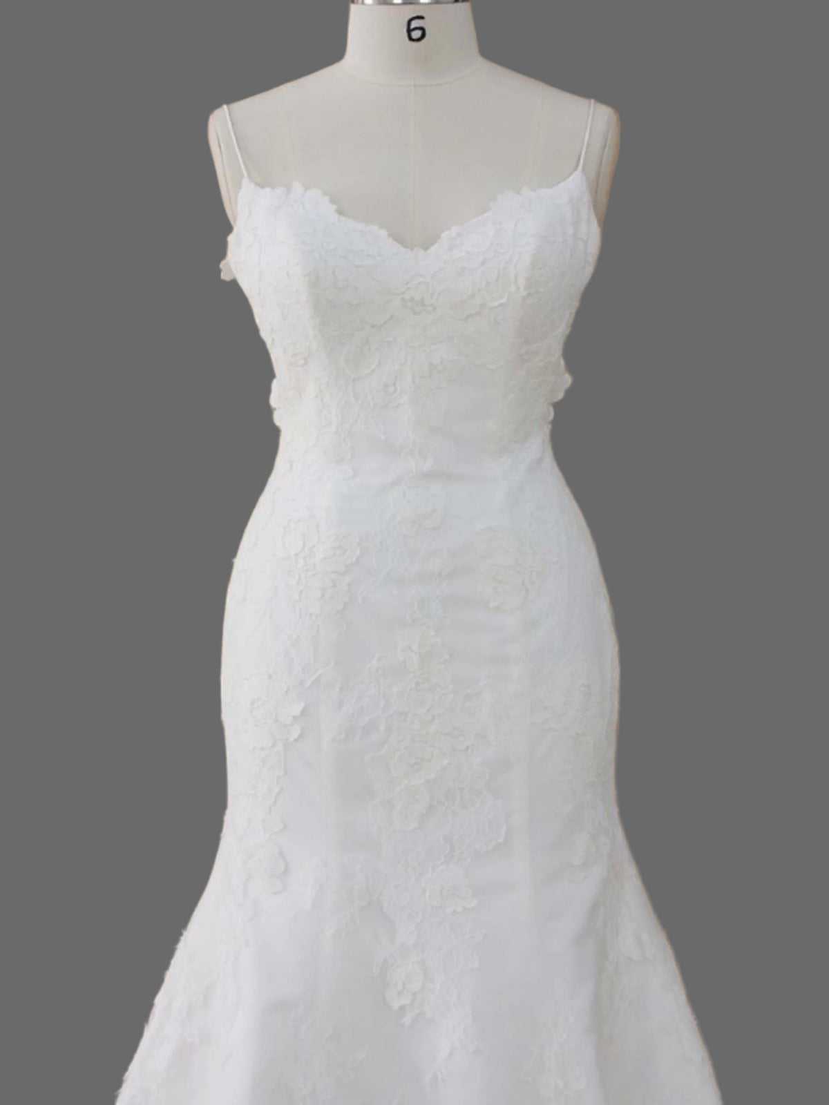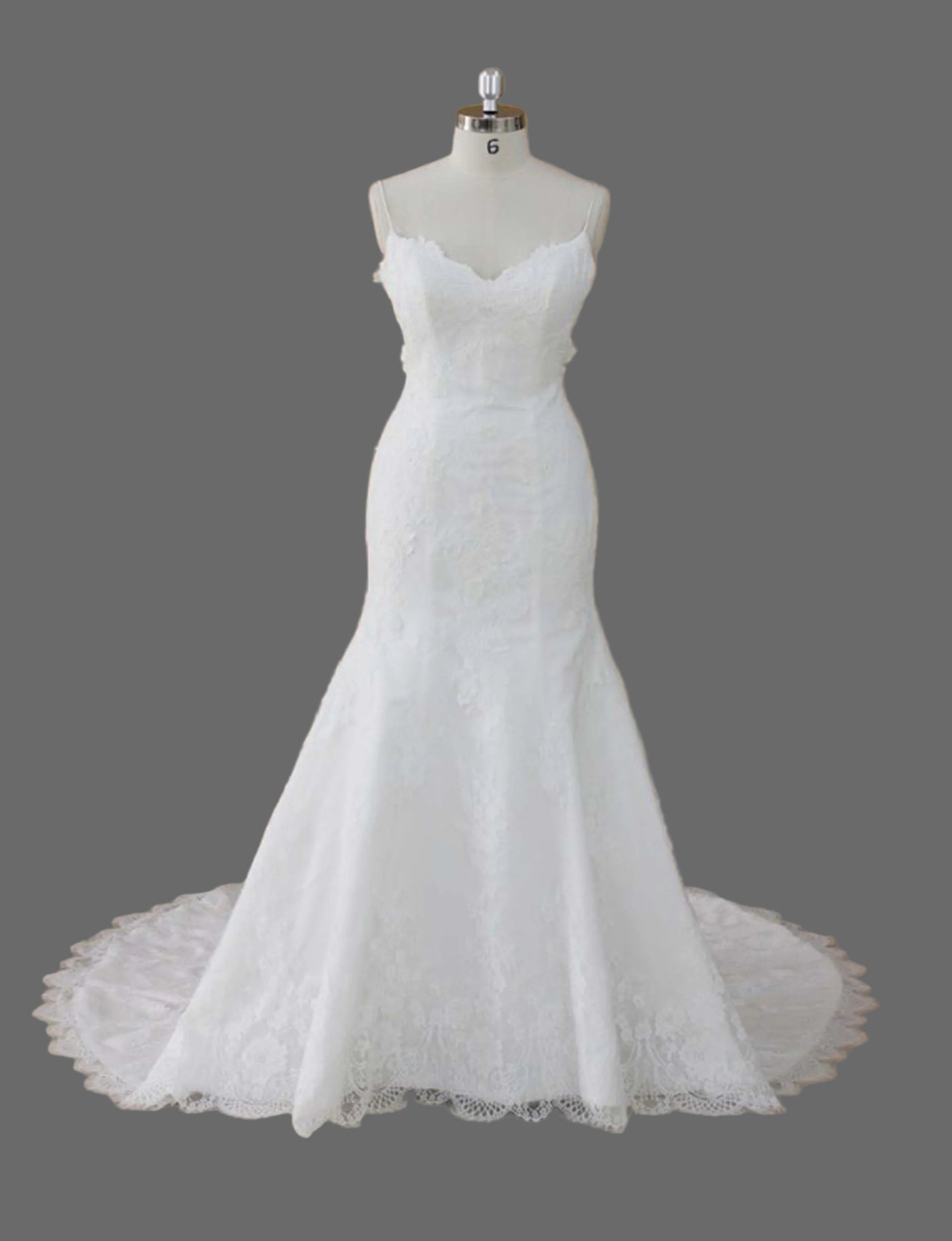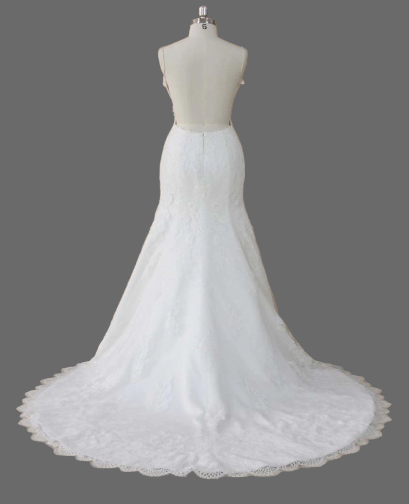 - Chapel train with delicate lace trim edging