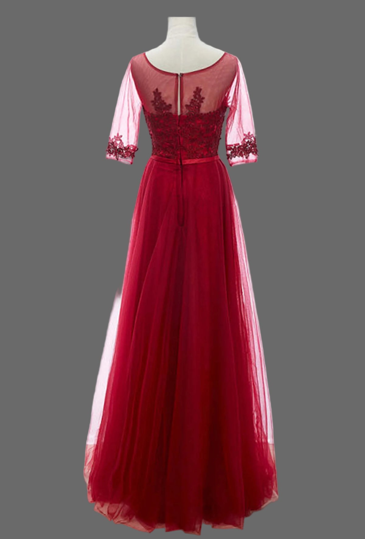 Exude timeless elegance in this sophisticated burgundy lace mother of the bride dress. This stunning formal gown features an illusion neckline with intricate lace appliqués, elegant half sleeves, and a flowing A-line silhouette perfect for weddings, galas, and special occasions.