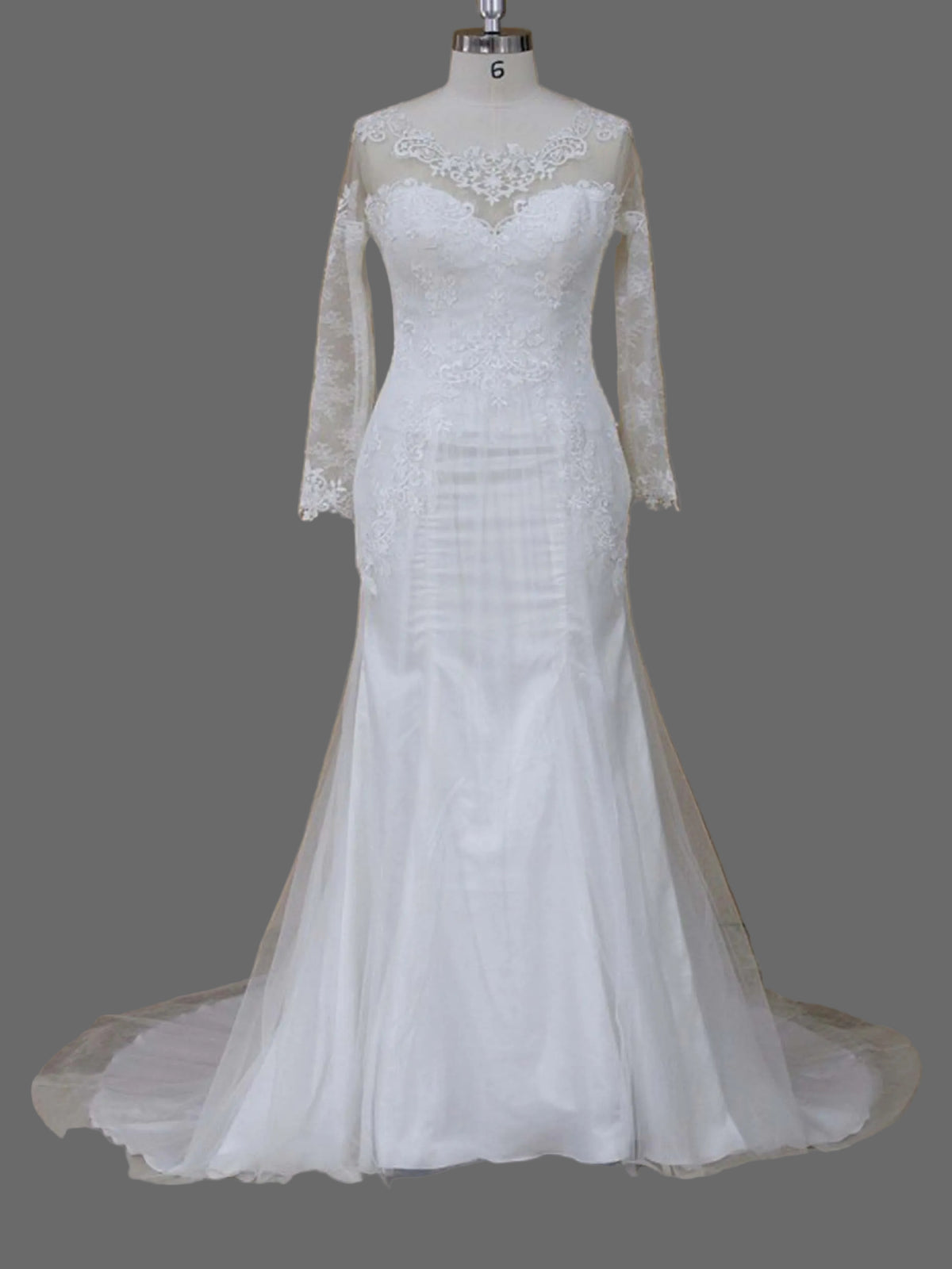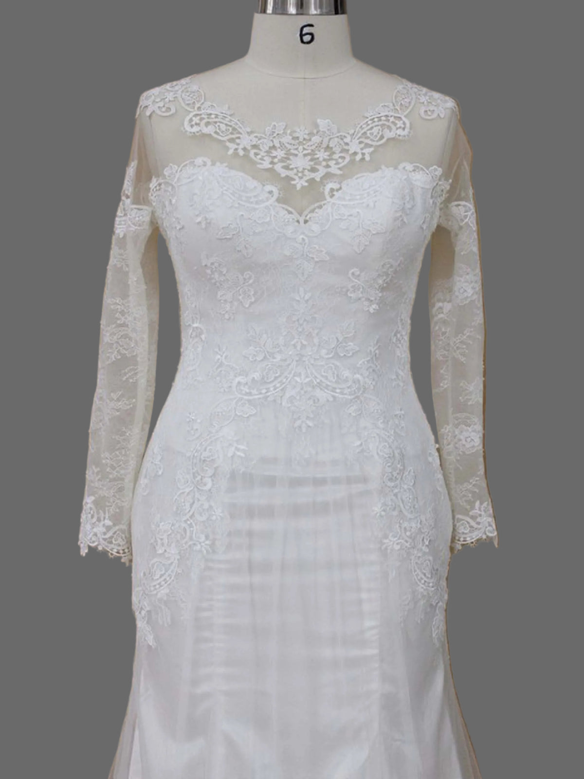 Featuring a romantic illusion neckline adorned with delicate lace appliqués, this gown beautifully frames the décolletage while offering sophisticated coverage. The fitted bodice hugs your curves before flowing into a classic mermaid silhouette that flares gracefully at the knee. Intricate lace detailing cascades down the sheer long sleeves, adding a touch of vintage romance.
