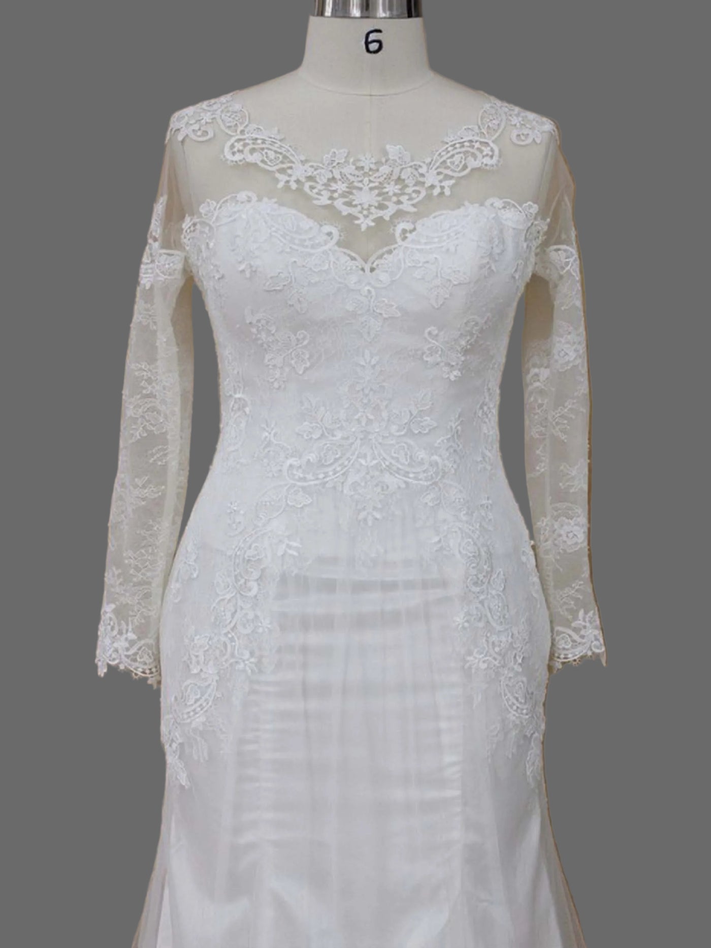 - Illusion bateau neckline with intricate lace detailing