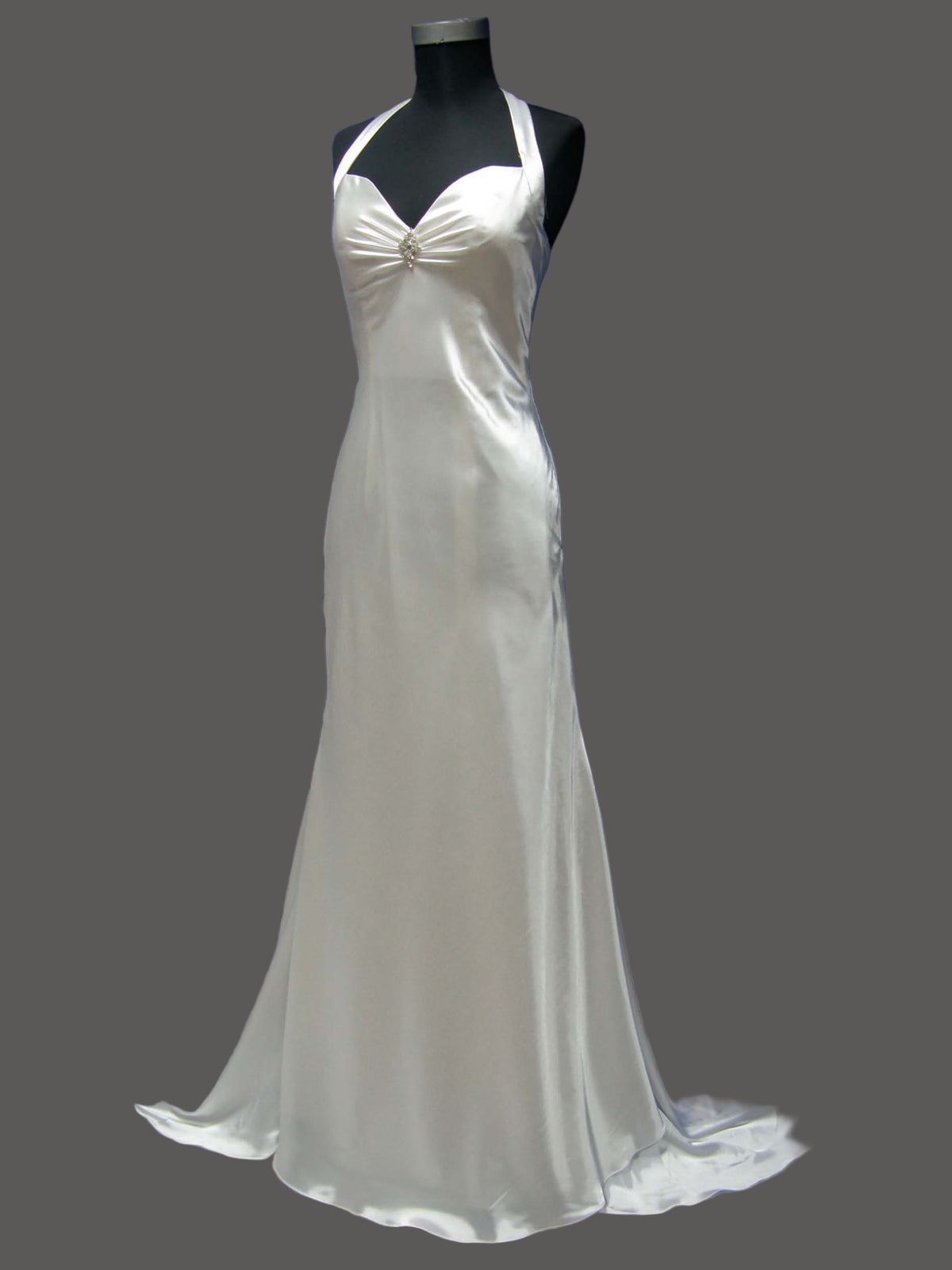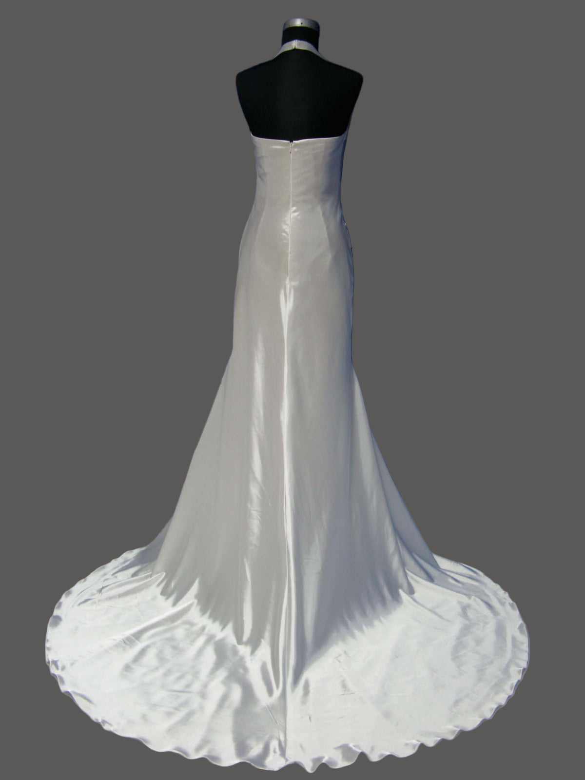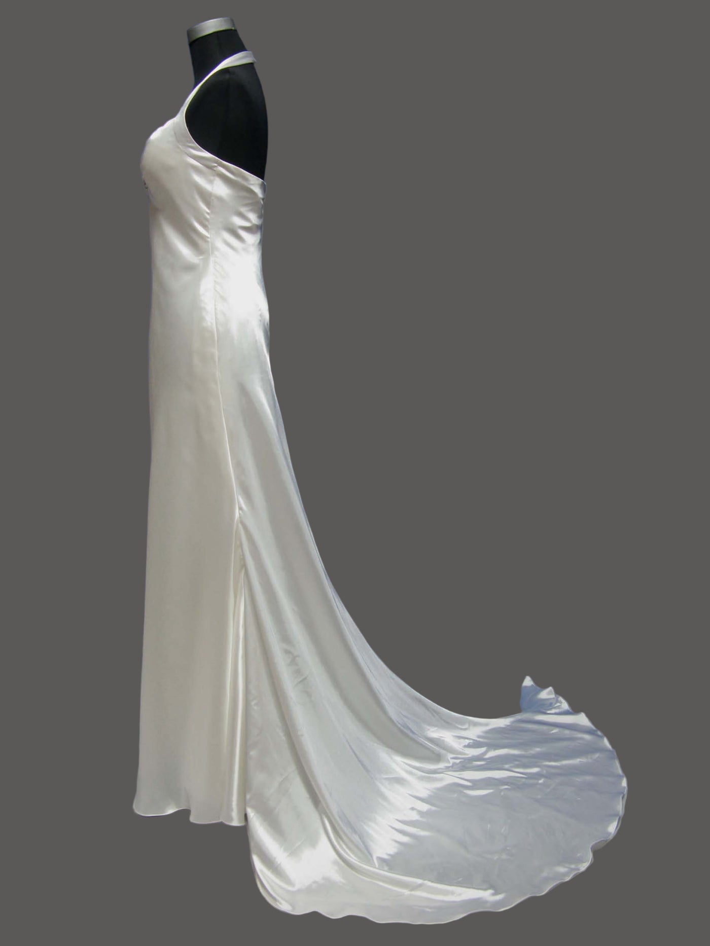 Elegant champagne satin wedding dress featuring a strapless sweetheart halter neckline, fitted bodice, and dramatic cathedral train. Perfect for brides seeking timeless luxury and romantic elegance.