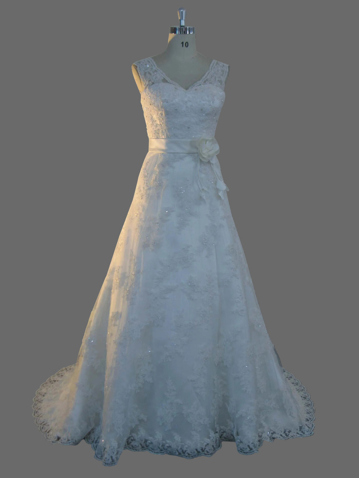 V-Neck A-Line Wedding Dress with Lace Appliques and Beaded Waist Sash - Cathedral Train Bridal Gown