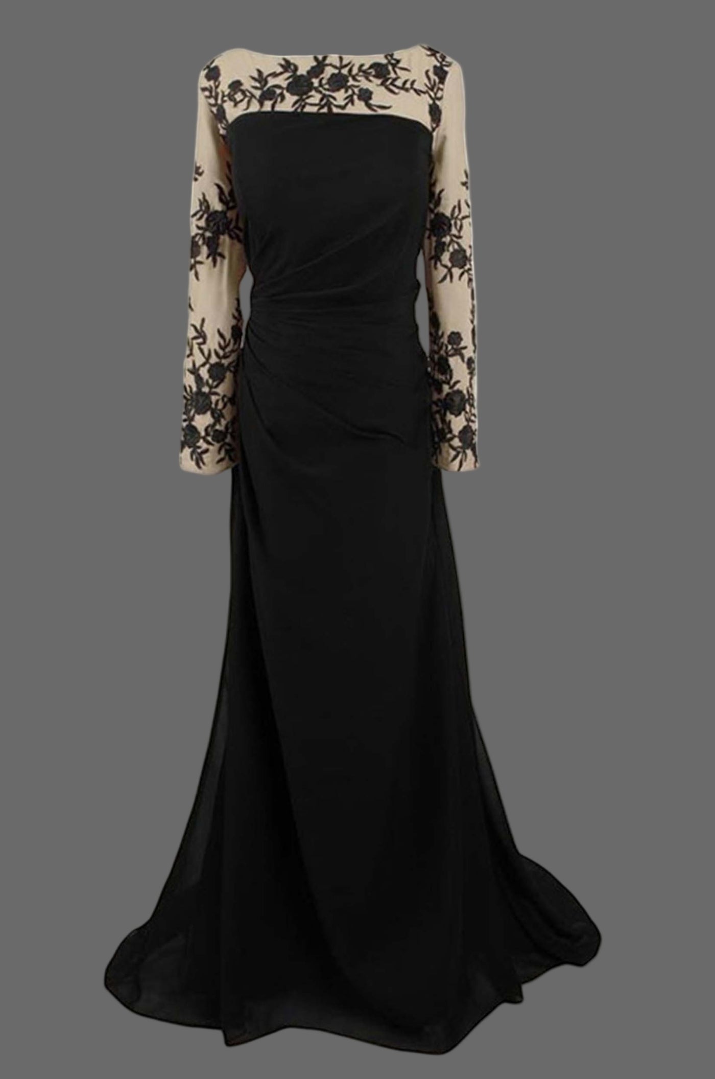 Elegant black evening gown featuring exquisite lace appliqué on sheer illusion sleeves and neckline. This sophisticated formal dress combines timeless elegance with modern design, perfect for weddings, galas, and black-tie events.