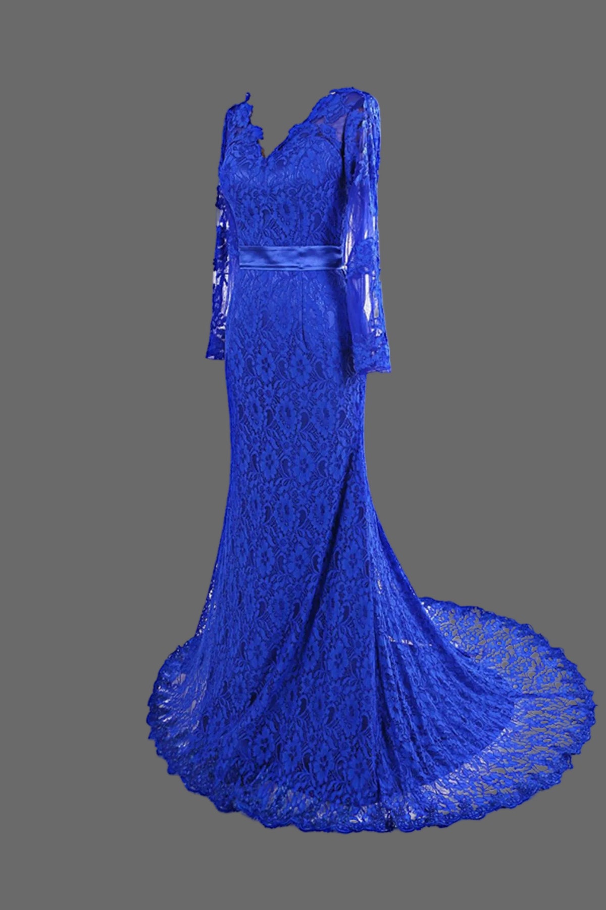 - Floor-length with elegant sweep train