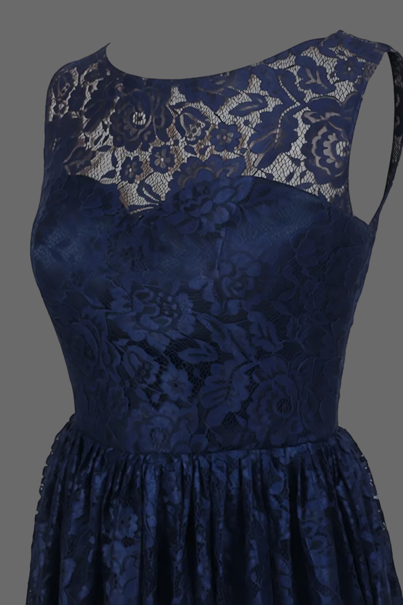 Make an elegant entrance in this exquisite navy blue lace cocktail dress that perfectly combines timeless sophistication with romantic charm. This enchanting short dress features delicate floral lace throughout and a flattering A-line silhouette, creating a refined look for any special occasion.