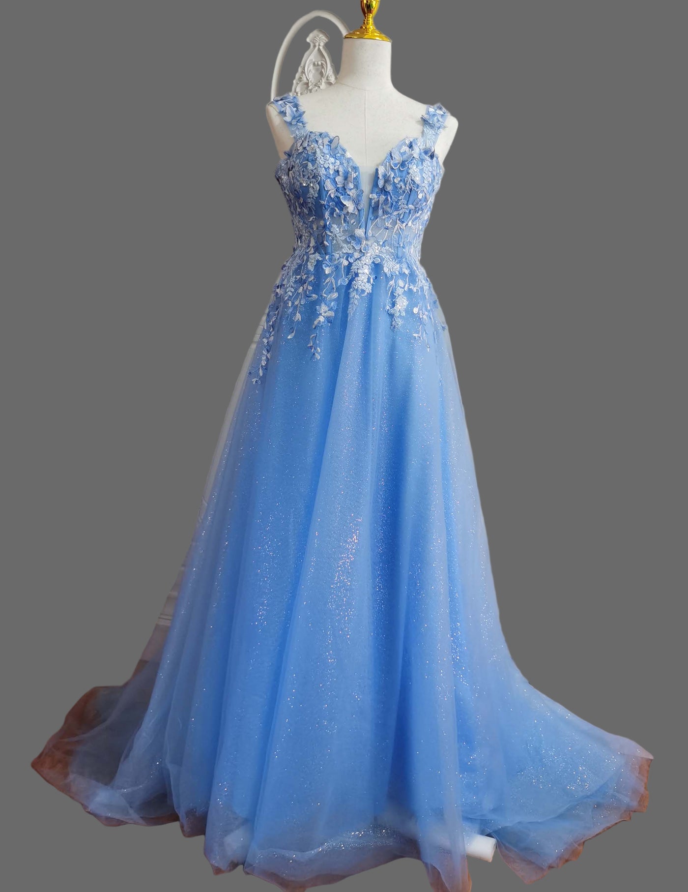 Blue Floral Lace Applique Tulle Prom Dress - V-Neck A-Line Evening Gown with Train - 28 / light blue