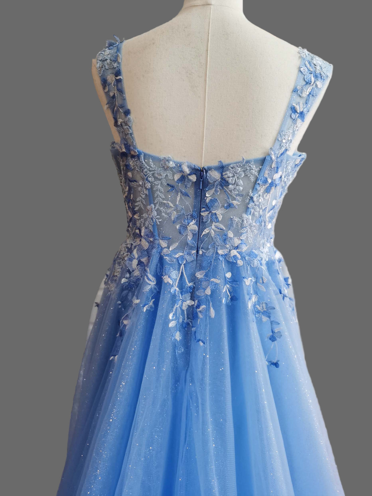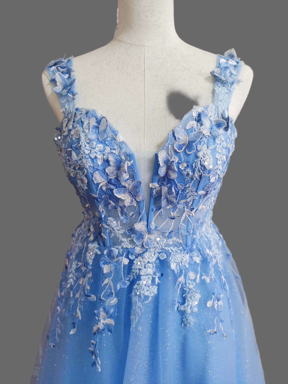 Blue Floral Lace Applique Tulle Prom Dress - V-Neck A-Line Evening Gown with Train