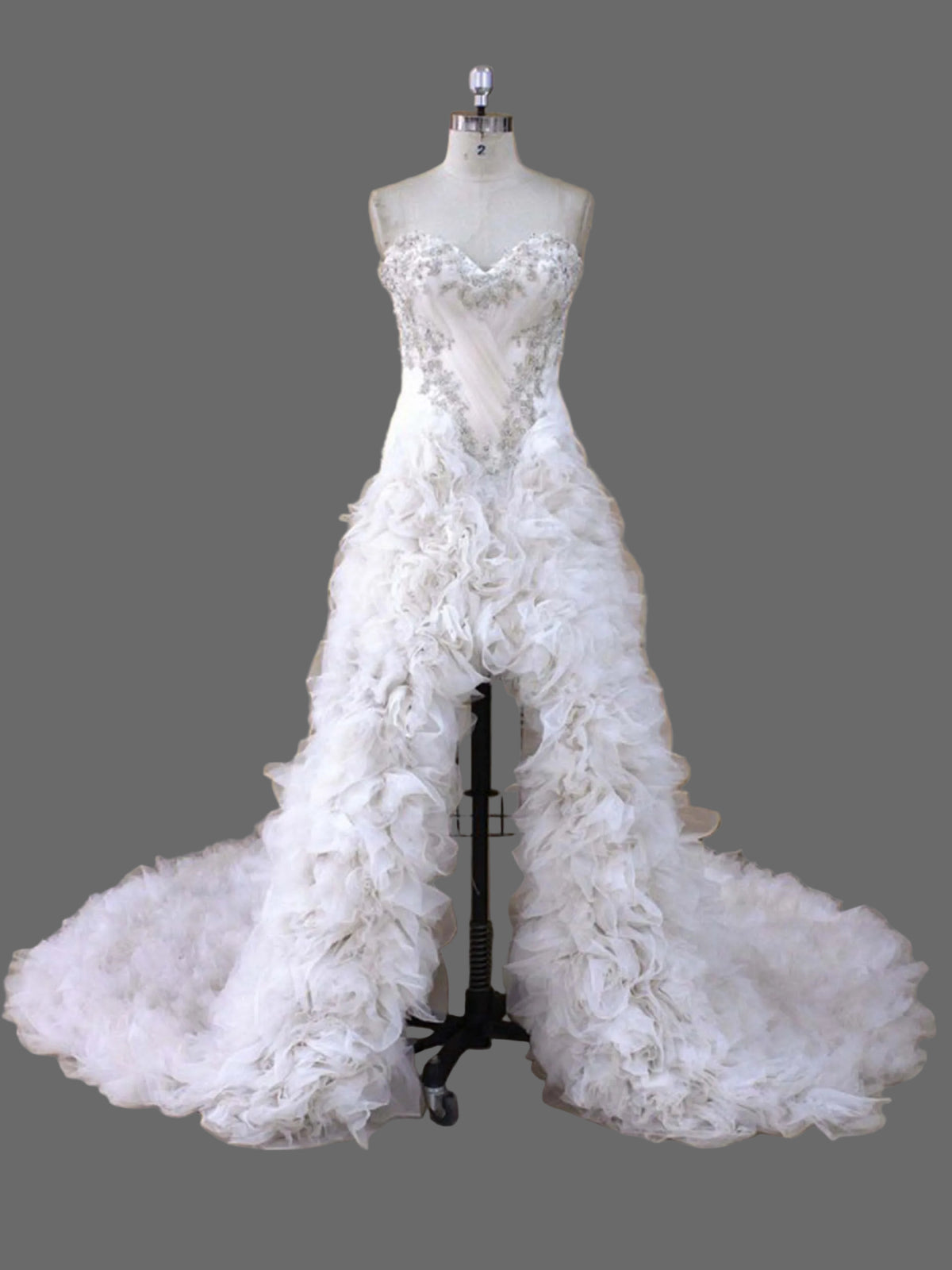Make an unforgettable statement in this show-stopping high-low wedding dress featuring luxurious 3D floral appliqués and dramatic ruffles. This avant-garde bridal gown combines romantic texture with bold design, perfect for the fashion-forward bride who wants to stand out on her special day.
